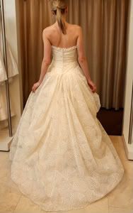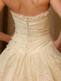 I love this ball gown with it's embroidered overlay, ruched bodice, scalloped hem and subtle ruffles.